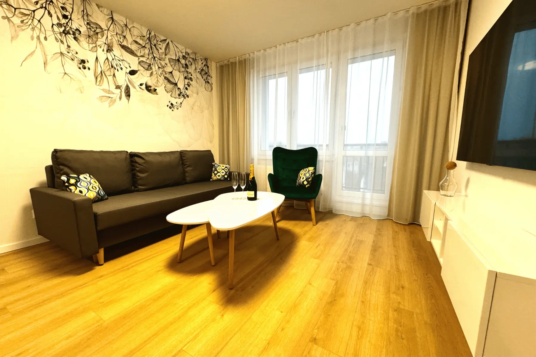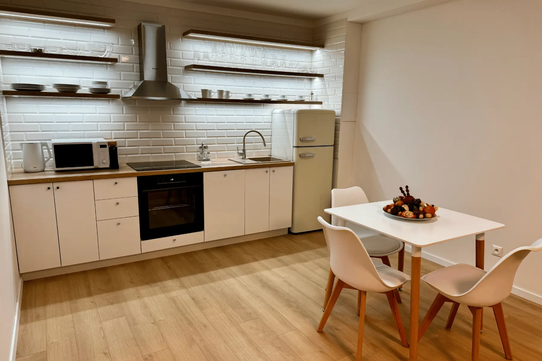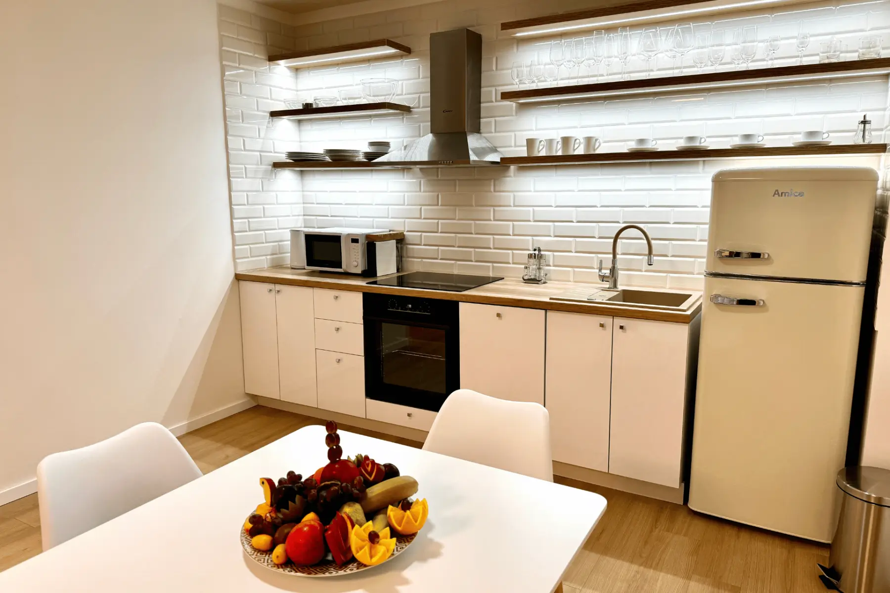 Vybavenie apartmánu: nový elegantný nábytok, postele, stoličky stôl a pohovka, župany, hotelová kozmetika, fén na vlasy, TV s káblovou televíziou, indukčná varná doska, chladnička s mrazničkou, mikrovlnná rúra, kávovar Nespresso + kapsule, kompletné stolovanie (taniere, poháre a kuchynský riad), práčka, umývačka riadu s kapsulami.